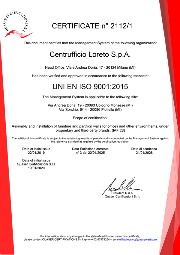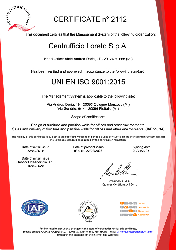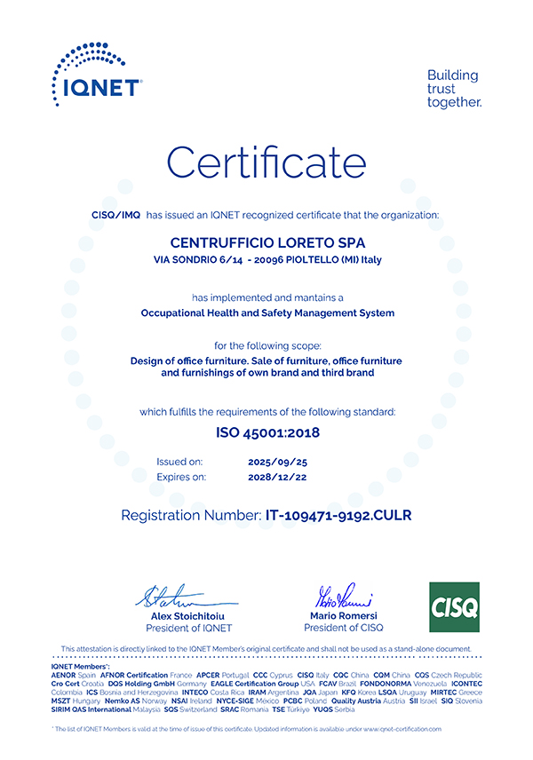 Centrufficio’s corporate health and safety management system is compliant with UNI EN 45001.