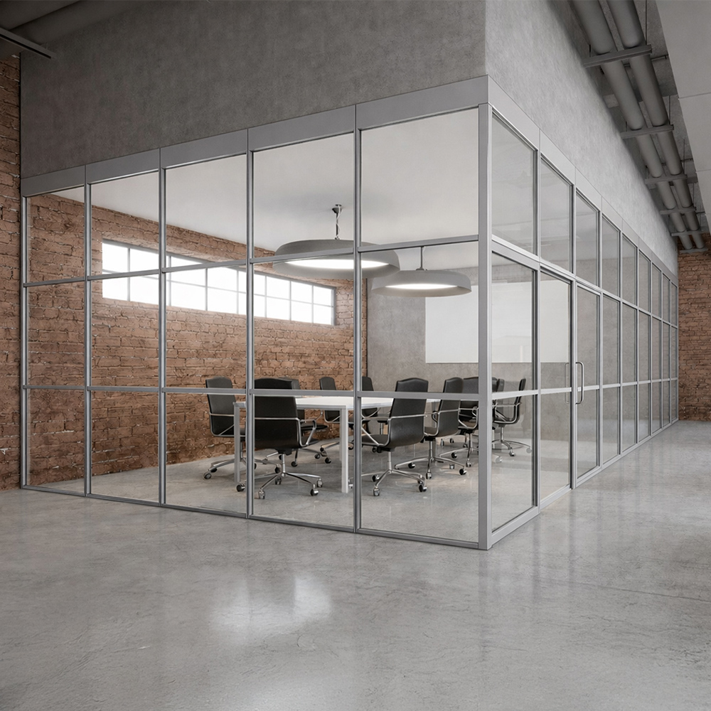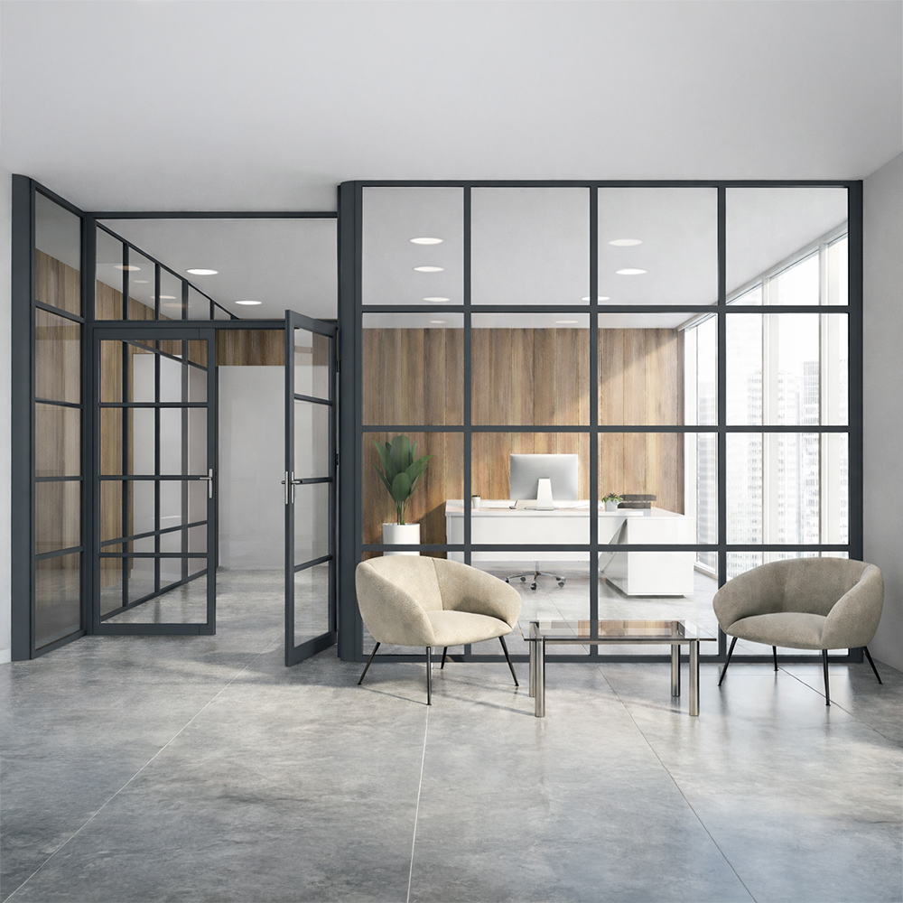BritWall is a single-glazed partition wall made of an aluminium structure with a thickness of 4 cm, laminated glass 55.1 for the glazed modules and 33.1 for the door glazing, all safety glass.