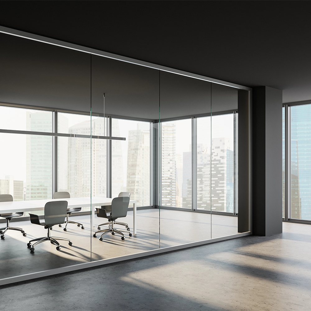 Cloison mobile vitrée, disponible en verre feuilleté 5 + 5 ou 6 + 6 ou verre trempé 10 mm.