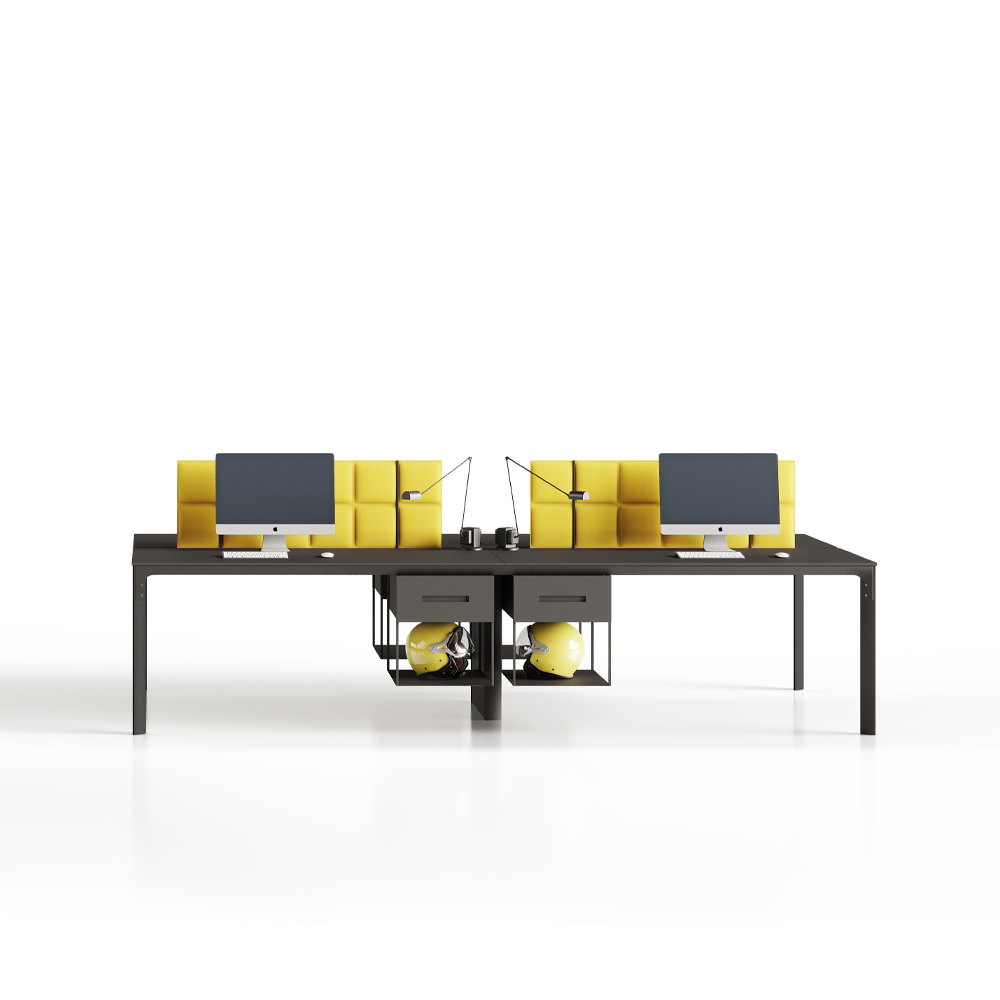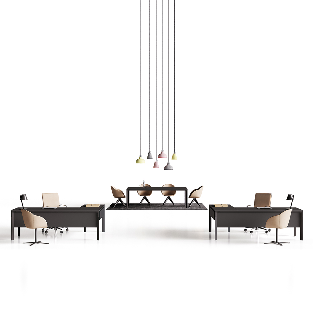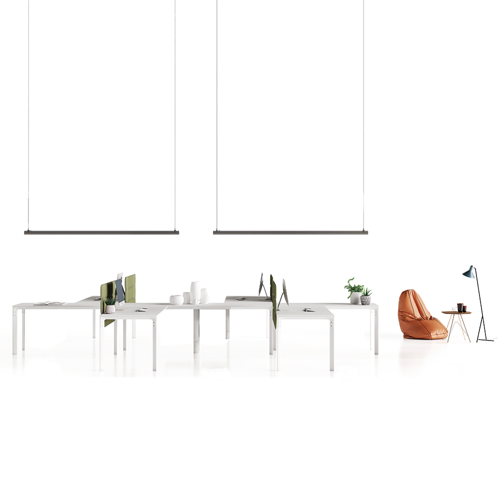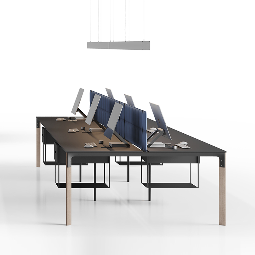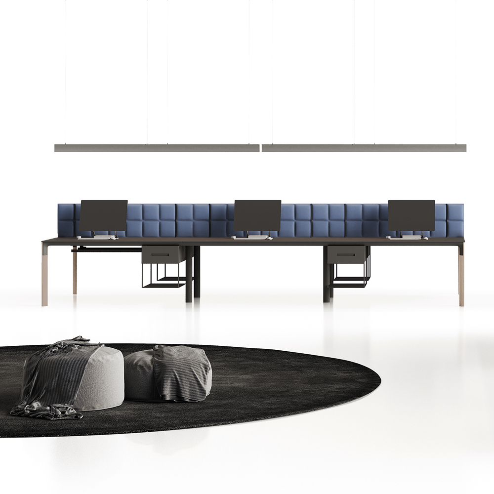 Les plans de travail sont dimensionnés à des profondeurs inhabituelles (77 et 57 centimètres) afin d'exploiter une parfaite modularité des plans et de la structure même dans les situations où les postes de travail sont tournés à 90 degrés les uns par rapport aux autres.