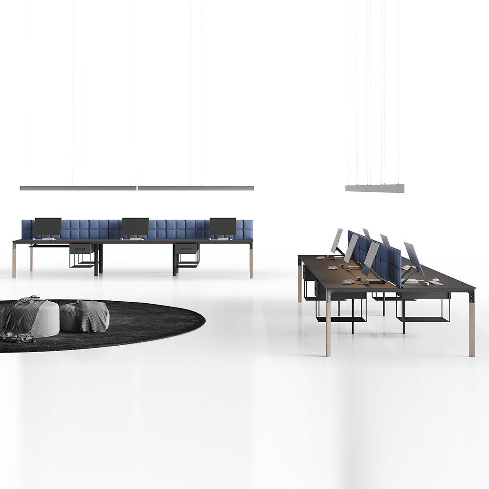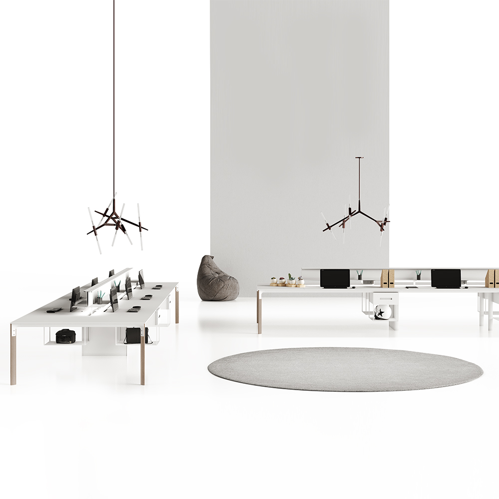 Seventy Seven est un système de mobilier de bureau composé d’une série de postes de travail caractérisés par une esthétique légère et contemporaine : un mince plateau en mélamine de 12 mm d’épaisseur repose sur une structure insaisissable agrémentée d’éléments de liaison qui évoluent à partir des poutres pour embrasser le pied.