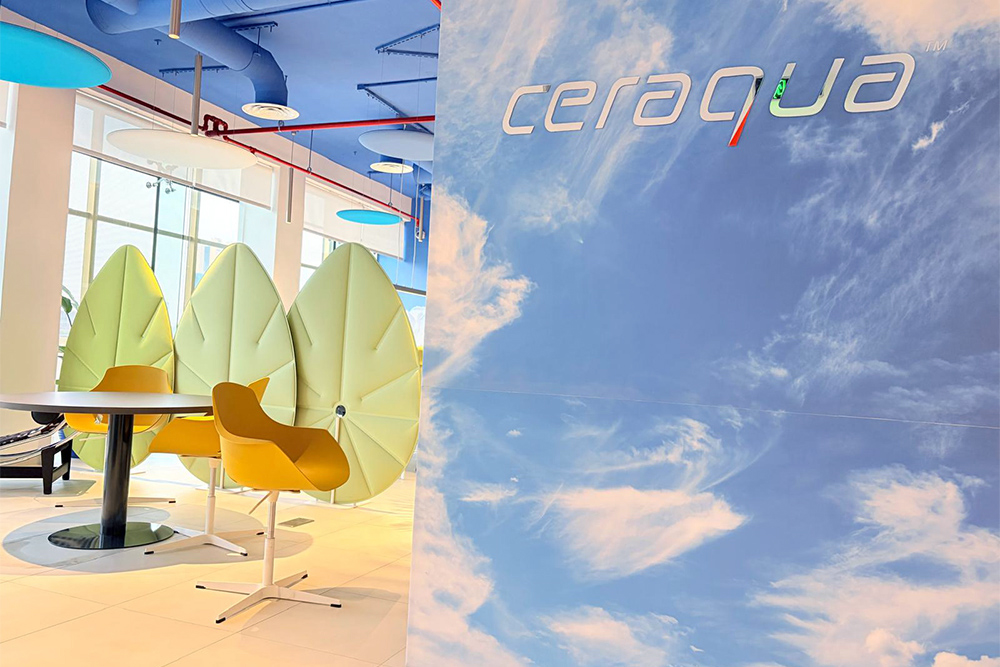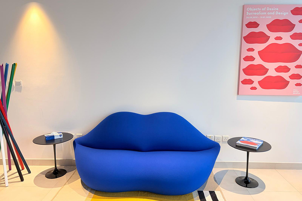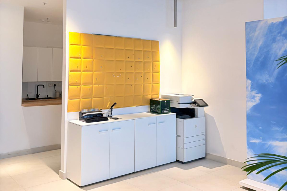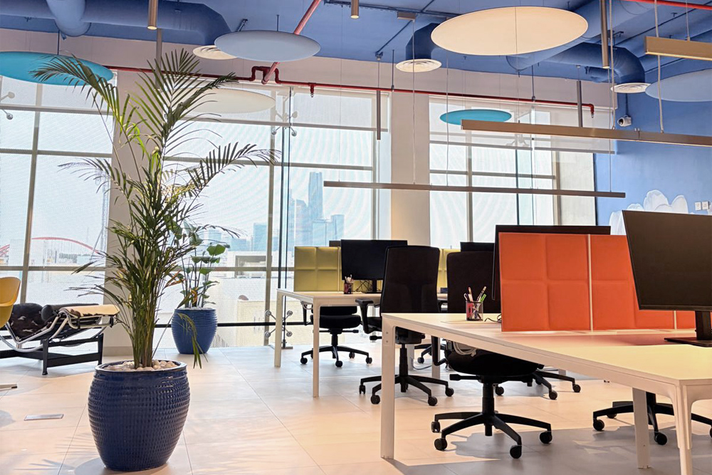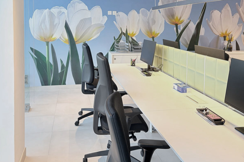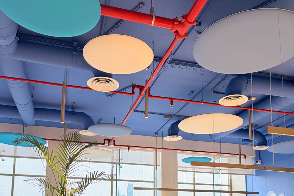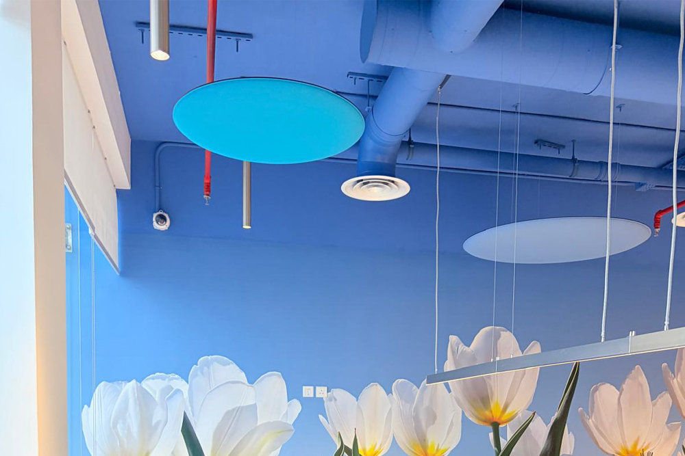 Un plafond bleu apparent avec des panneaux acoustiques circulaires suspendus ajoute une forte identité visuelle tout en améliorant le confort acoustique. Un motif floral mural apporte une touche naturelle et apaisante qui équilibre le caractère industriel de l’espace.